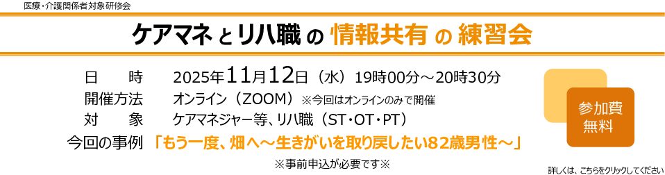 - 【開催日:R7/11/12】 「ケアマネとリハ職の情報共有の練習会」(医療介護関係者向け研修会)New