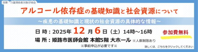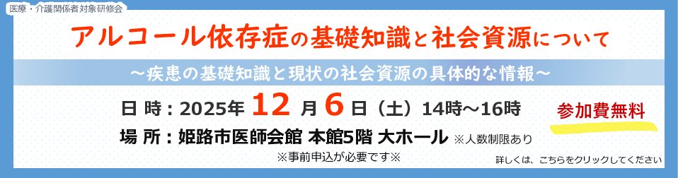 - 【開催日:R7/12/6】 「アルコール依存症の基礎知識と社会資源について~疾患の基礎知識と現状の社会資源の具体的な情報~」(医療介護関係者向け研修会)New